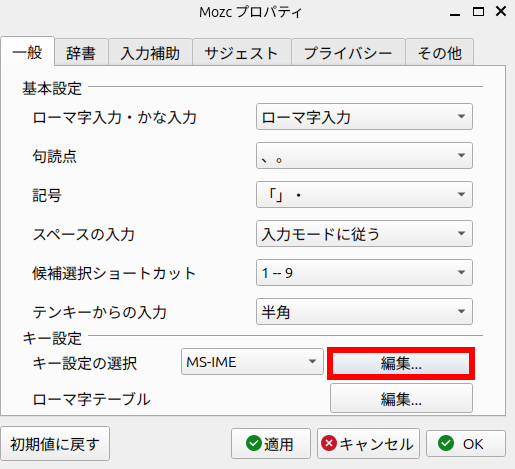 例えば Ubuntu 25.04 の場合、デスクトップ 右上の Mozc のアイコンをクリック > ツール > プロバティ でウィンドウが開き、「キーの選択」の 「MS-IME」の右の「編集」をクリックして、